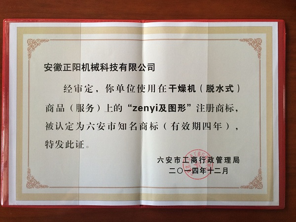 “zenyi”牌干燥機(jī)(脫水式)商標(biāo)榮獲六安市知名商標(biāo)稱號(hào)